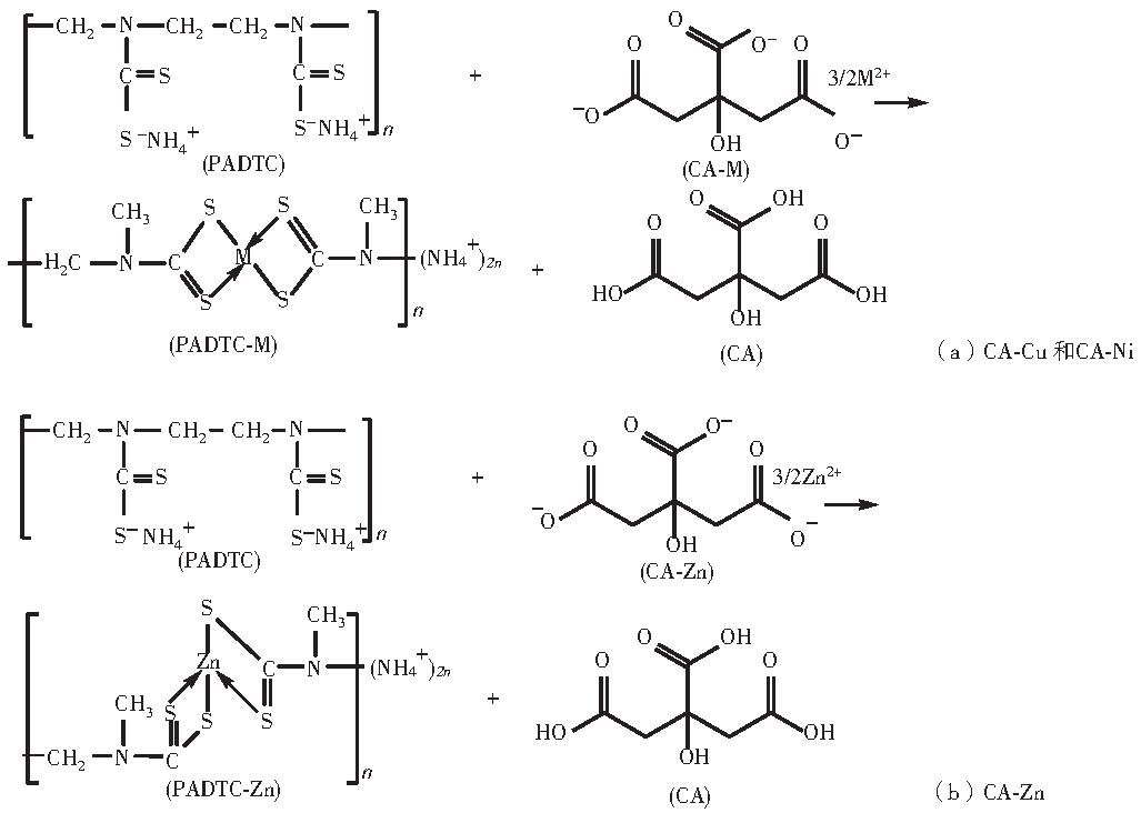 以絡(luò)合劑CA為例,PADTC抓捕重金屬的機(jī)理如圖5所示(其中M 代表Cu 或者Ni)。銅原子的原子序數(shù)為29,其失去3d軌道和4s軌道的2個(gè)電子后形成銅離子,銅離子在與PADTC形成配合物時(shí),采取dsp2雜化軌道成鍵,構(gòu)型為平面四方形結(jié)構(gòu),中心離子銅的配位數(shù)為4,機(jī)理如圖5(a)所示。Ni的電子結(jié)構(gòu)為3d84s2,失去4s軌道上的2個(gè)電子后形成鎳離子。當(dāng)PADTC抓捕鎳離子時(shí),鎳離子的8個(gè)3d電子發(fā)生重排,空出一個(gè)d軌道與4s和4p軌道雜交成dsp2軌道。雜化軌道為平面四方形結(jié)構(gòu),所以PADTC-Ni 是平面正方形。反應(yīng)抓捕機(jī)理和銅類似,也是形成平面正方形,如圖5(a)所示。Zn 的電子結(jié)構(gòu)為3d104s2,失去4s軌道上的2個(gè)電子形成鋅離子。當(dāng)與PADTC反應(yīng)時(shí),鋅離子的3d軌道是飽和的,因此,形成sp3 軌道,構(gòu)型為正四面體結(jié)構(gòu),中心離子的配位數(shù)也為4,抓捕機(jī)理如圖5(b)所示。