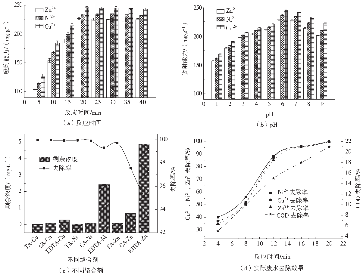 在室溫條件下,取250 mL、100 mg·L−1模擬CA-Cu、CA-Ni、CA-Zn廢水置于250 mL 錐形瓶中,加入0.1 g重金屬捕集劑PADTC,置于搖床中振蕩5 min后再靜置15 min,取上清液過濾后用原子吸收分光光度計(jì)測定溶液中殘留的重金屬離子濃度,分別研究了pH和反應(yīng)時(shí)間對PADTC去除重金屬的影響,以及對CA、TA、EDTA 3種絡(luò)合劑與Cu、Ni、Zn 3種重金屬離子絡(luò)合后的處理效果。