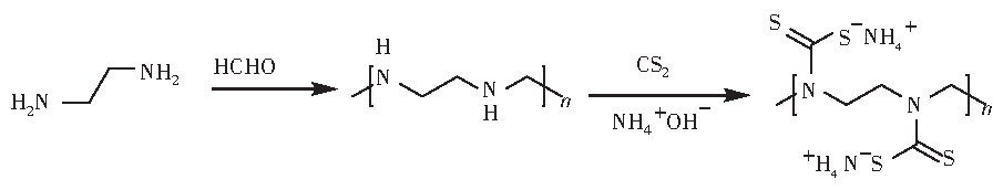 制備PADTC的基本反應(yīng)方程見式(1)。乙二胺和甲醛縮合形成聚合物,然后發(fā)生親核反應(yīng),在堿性條件下與二硫化碳形成聚-二硫代氨基甲酸銨鹽(PADTC)。