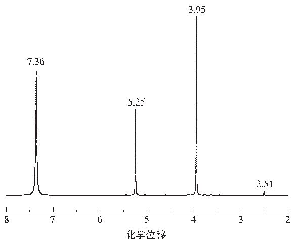 PADTC的1H和13C核磁共振光譜如圖2和圖3所示。在圖2氫譜中,化學(xué)位移為5.25、3.95、7.36的峰分別屬于—CH2、—CH2—CH2和NH4+中的氫。在圖3碳譜中,70.92、51.18和208.67的化學(xué)位移屬于—CH2、—CH2—CH2和—S—C═S中的碳。