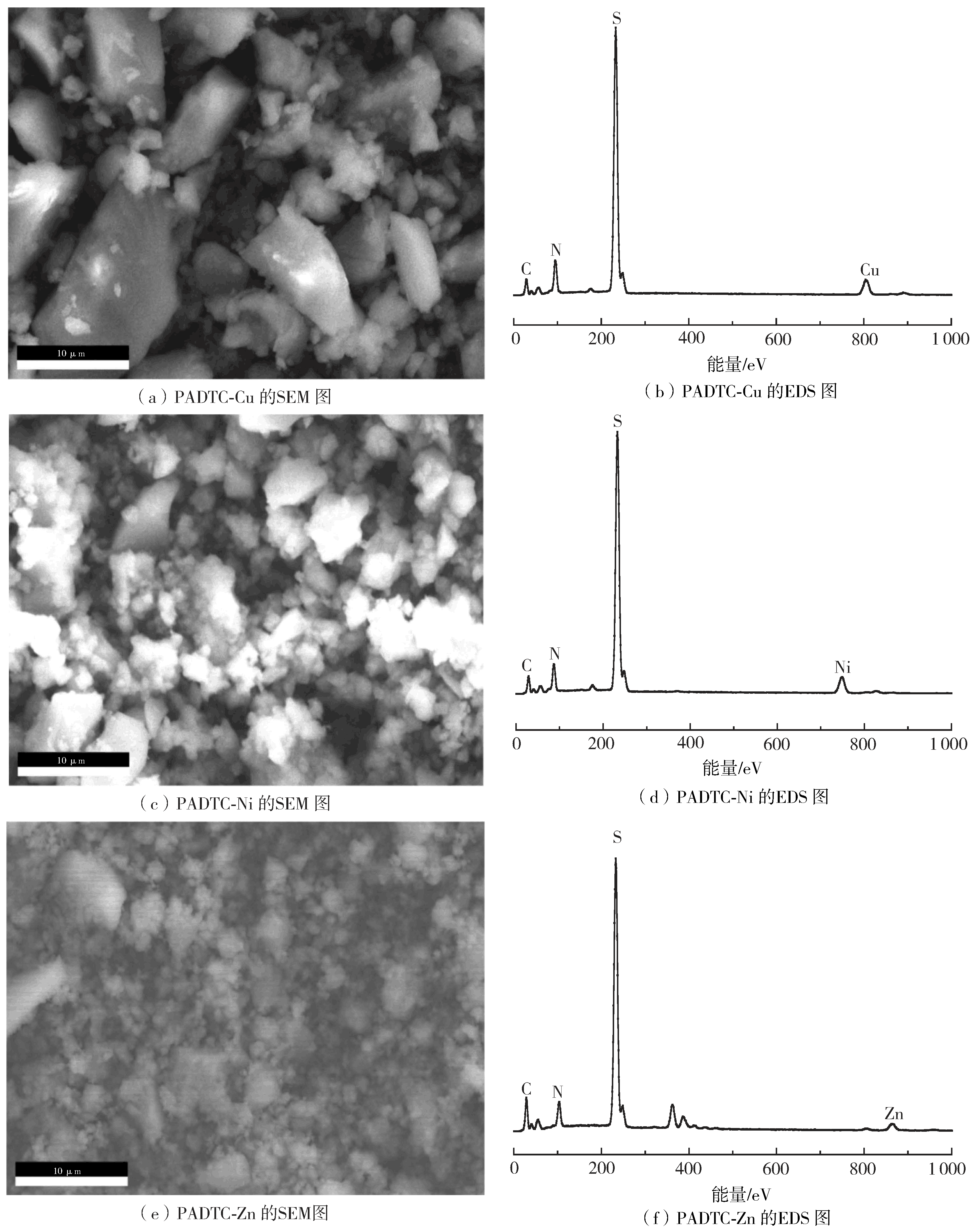 沉淀PADTC-Cu、Ni和Zn的電鏡掃描-能譜(SEM-EDS)分析如圖6所示,沉淀PADTC-Cu、Ni和Zn的電鏡掃描圖6(a)、(c)、(e)均顯示沉淀表面疏松多孔。其對應(yīng)的能譜圖上分別有Cu、Ni和Zn元素峰出現(xiàn),與 PADTC的元素分析相比較,Cu、Ni和Zn元素峰的出現(xiàn)表明PADTC捕集到了重金屬離子Cu、Ni和Zn 。