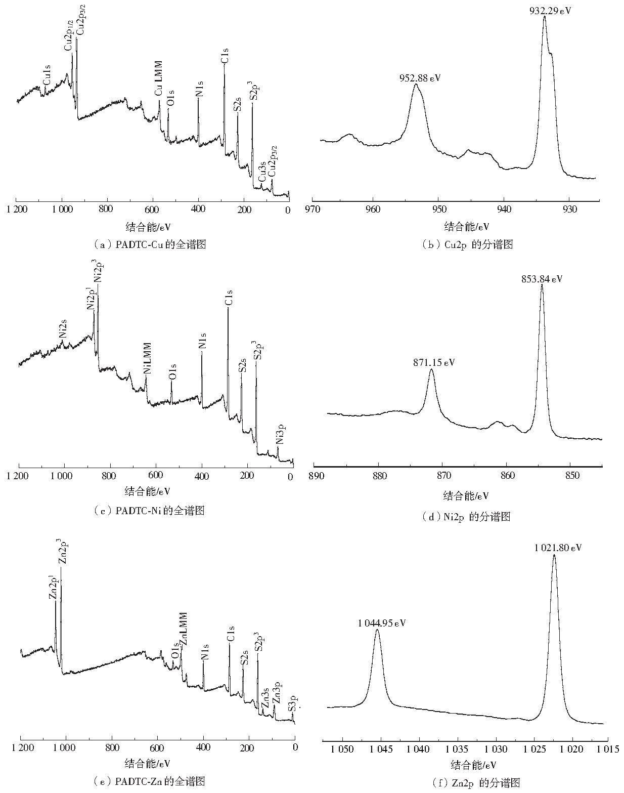 PADTC抓捕重金屬后沉淀PADTC-Cu、Ni和Zn的XPS如圖7所示。Cu1s的高分辨光譜位于1 070.79 eV處,Cu2p1/2、Cu2p2/3和Cu3p2/3的峰分別在952.88、932.29和77.02 eV,如圖7(a)和圖7(b)所示。S2s和S2p3的結(jié)合能分別位于227.70和162.83 eV處,由此可以推斷出S一Cu的存在[24]。Ni3p的高分辨率光譜位于66.22 eV,分別在871.15和853.84 eV處觀察到Ni2p1和Ni2p3的峰,如圖7(d)所示,因此證明了Ni2+的存在。此外,S2s和S2p3的結(jié)合能位于227.26和160.79 eV,這表明PADTC-Ni沉淀中存在S一Ni鍵。Zn2p的高分辨率光譜如圖7(f)所示,在1 021.80 eV(Zn2p3/2)和1 044.95 eV(Zn2p1/2)處,表明沉淀PADTC-Zn中Zn2+的存在,S2s和S2p3的結(jié)合能分別位于227.30和160.81 eV處,這表明沉淀中S—Zn的存在。531.80 eV處的O1s的峰值表明,可能是因?yàn)槌恋肀┞对诳諝庵斜谎趸徊糠郑瑥亩蠴1s 的峰的出現(xiàn)。